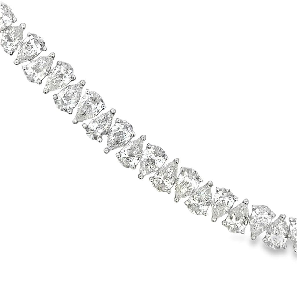 This stunning 18K white gold tennis bracelet showcases an exquisite line of pear-shaped diamonds, meticulously set to highlight their brilliance and unique silhouette. The elegant design and shimmering diamonds make this bracelet an exceptional piece for formal occasions or adding a refined touch to everyday wear. A timeless and luxurious addition to any jewelry collection.
