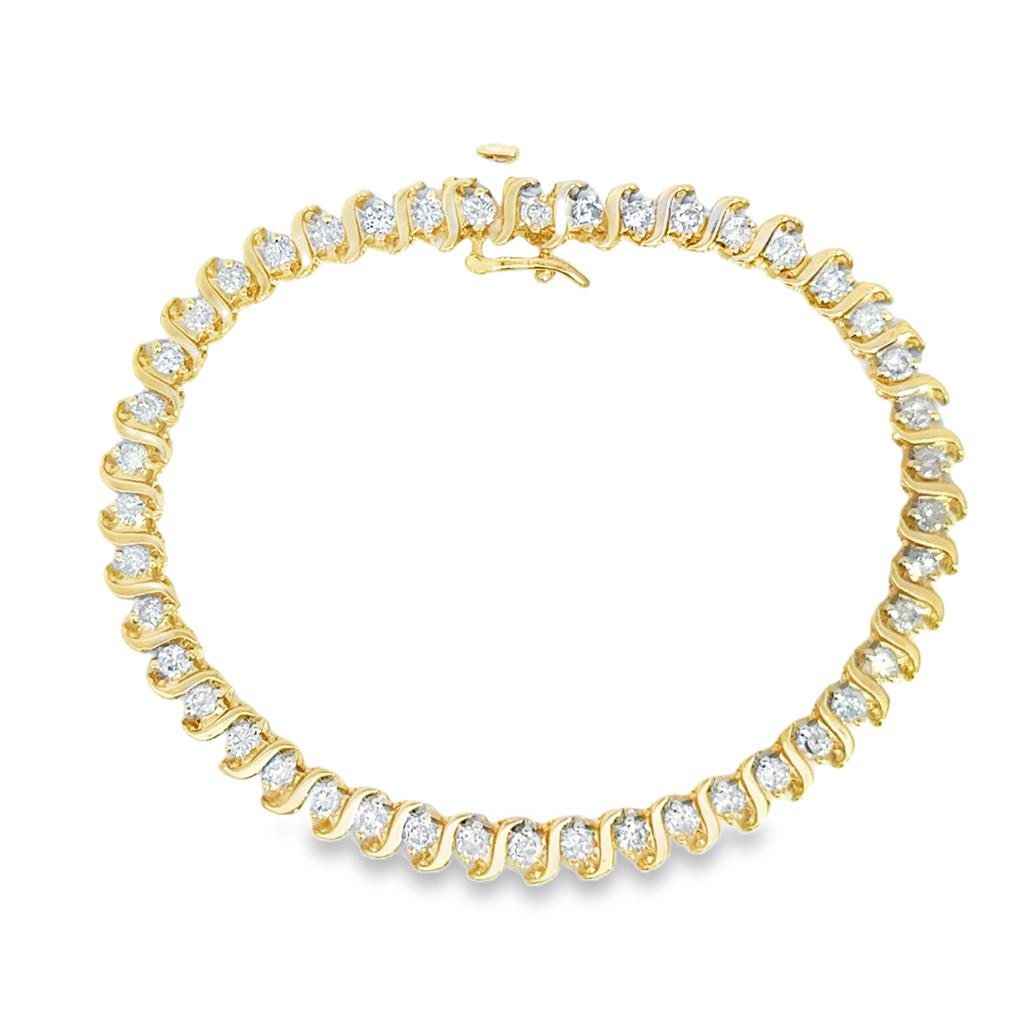 This stunning pre-owned tennis bracelet is crafted in 14K yellow gold and showcases 2.60 carats total weight of sparkling round diamonds. Each diamond is elegantly set along the 5mm-wide bracelet, creating a continuous line of brilliance. Measuring 7 inches in length, this timeless piece offers classic sophistication and a luxurious, fluid feel on the wrist—perfect for both everyday elegance and special occasions.