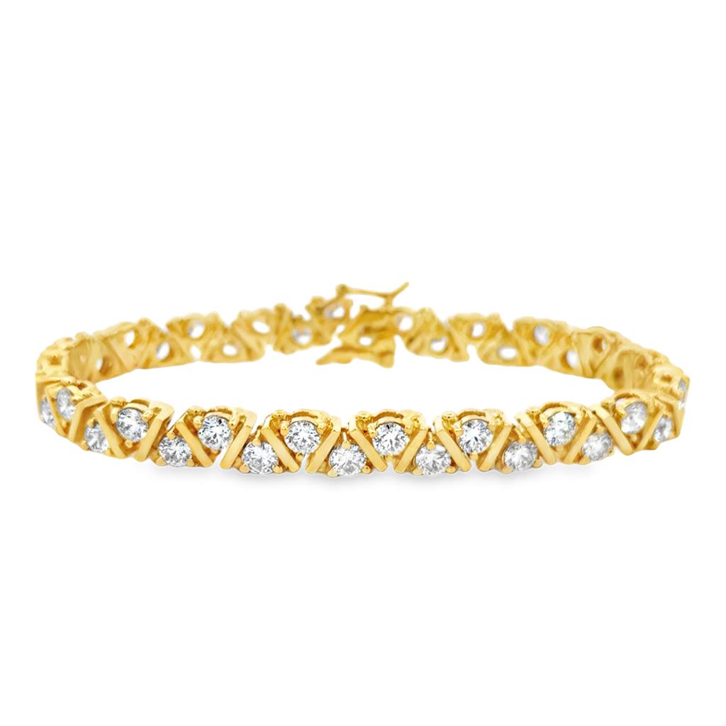 This radiant 14K yellow gold tennis bracelet showcases 9.5 carats total weight of brilliant round diamonds, each securely nestled within distinctive “X” shaped links. The crisscross pattern adds a touch of dimensional elegance, giving the bracelet a refined yet contemporary appeal. Each diamond glistens from its individual prong setting, catching the light from every angle. Measuring 7mm in width and 7.5 inches in length, the bracelet features a secure box clasp with a safety latch for added peace of mind. A bold yet timeless design, ideal for formal occasions or everyday luxury.