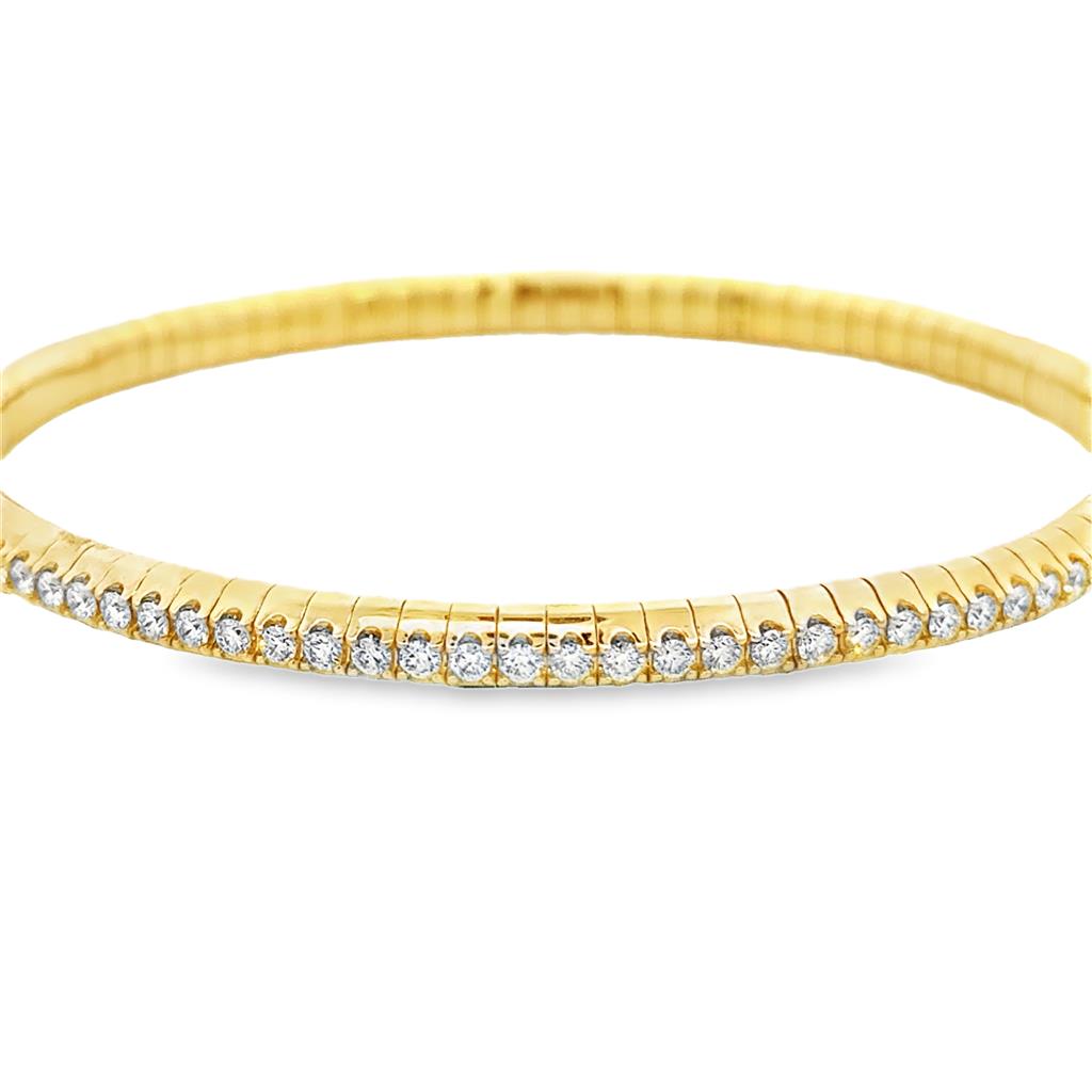 This elegant new diamond stretch bracelet is crafted in rich 14K yellow gold and features round diamonds totaling an impressive 2.00 CTW. Designed with a flexible stretch construction, the bracelet slips on effortlessly while maintaining a sleek, continuous silhouette. Measuring approximately 3.8mm wide and weighing 14.13 grams, it offers a refined balance of sparkle and comfort. Perfect worn alone or stacked with other favorites, this diamond stretch bracelet delivers timeless luxury with everyday ease.