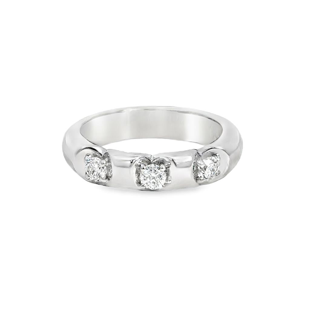 This pre-owned 18K white gold band features a substantial, heavy design accented with 0.50 carats total weight of round diamonds. Each diamond is set within a heart-shaped setting, adding a subtle romantic detail to the modern, polished band. Measuring 5.5mm wide, this ring offers a bold yet elegant presence. Currently a size 9.75, it can be sized for the ideal fit.