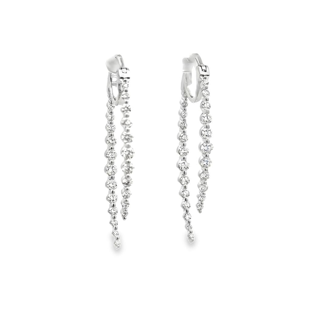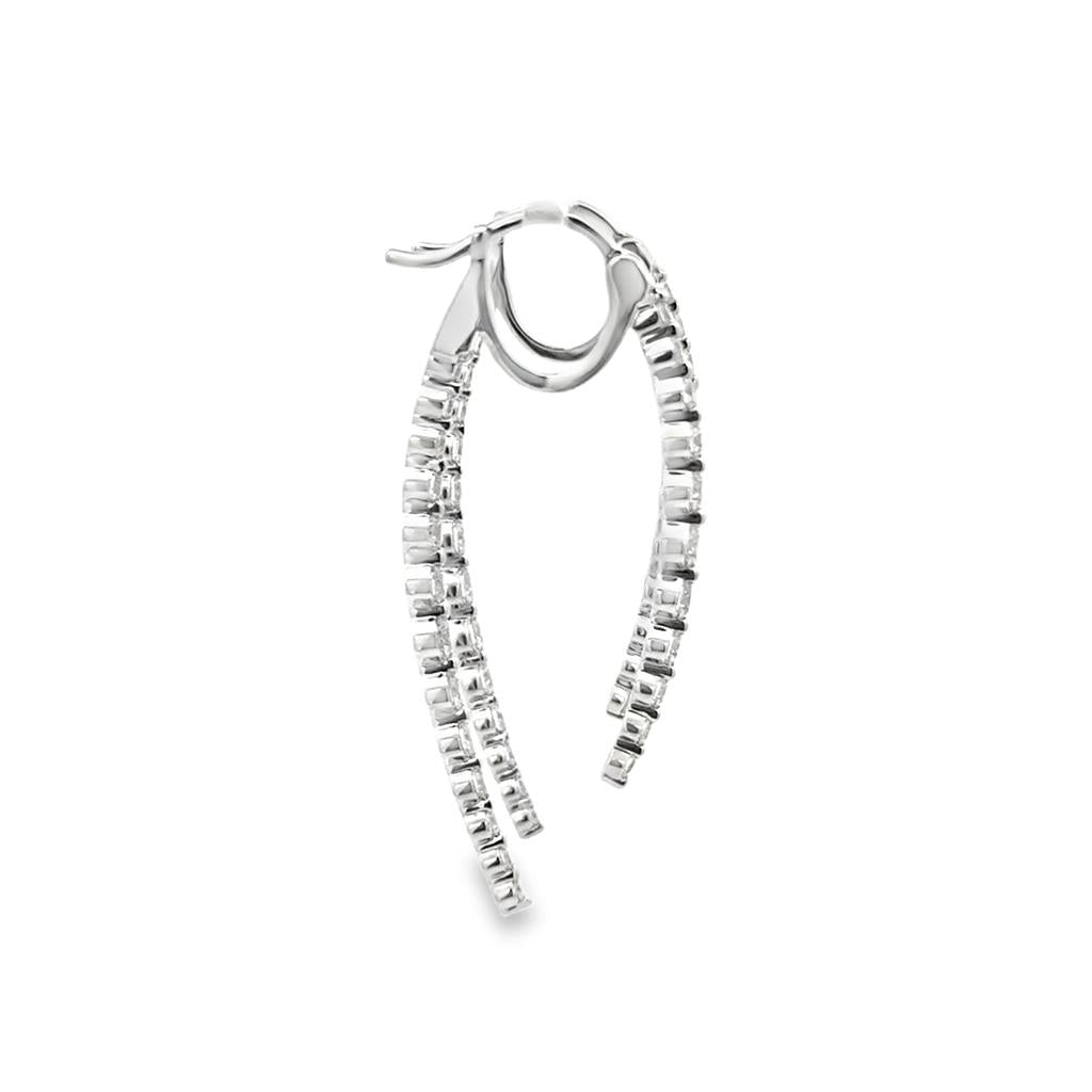These striking inside-out diamond drop earrings are crafted in radiant 14K white gold and set with a total of 1.72 CTW of sparkling round diamonds. The dual-strand design creates a graceful cascading effect, showcasing diamonds from every angle for maximum brilliance. Measuring 1 3/4 inches long and 2.5mm wide, the earrings offer elegant movement and a refined silhouette. Weighing 5.75 grams and brand new, this pair brings modern sophistication and luxurious sparkle to any look.