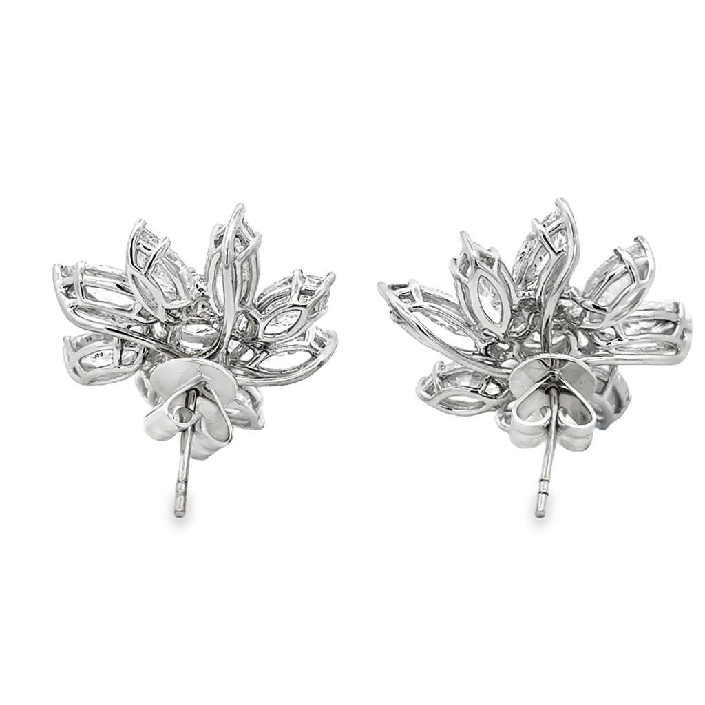 These breathtaking new floral earrings showcase an extraordinary 10.93 carats total weight of marquise-cut diamonds arranged in elegant petal formations. At the center of each bloom sits a brilliant round diamond, contributing to a combined 2.02 carats total weight of round diamonds for added fire and dimension. Crafted in luxurious 18K white gold, the sculpted floral design creates stunning movement and sparkle from every angle. Measuring 33mm in diameter and weighing 9.9 grams, these statement earrings are secured with classic post backs, offering both glamour and comfort.