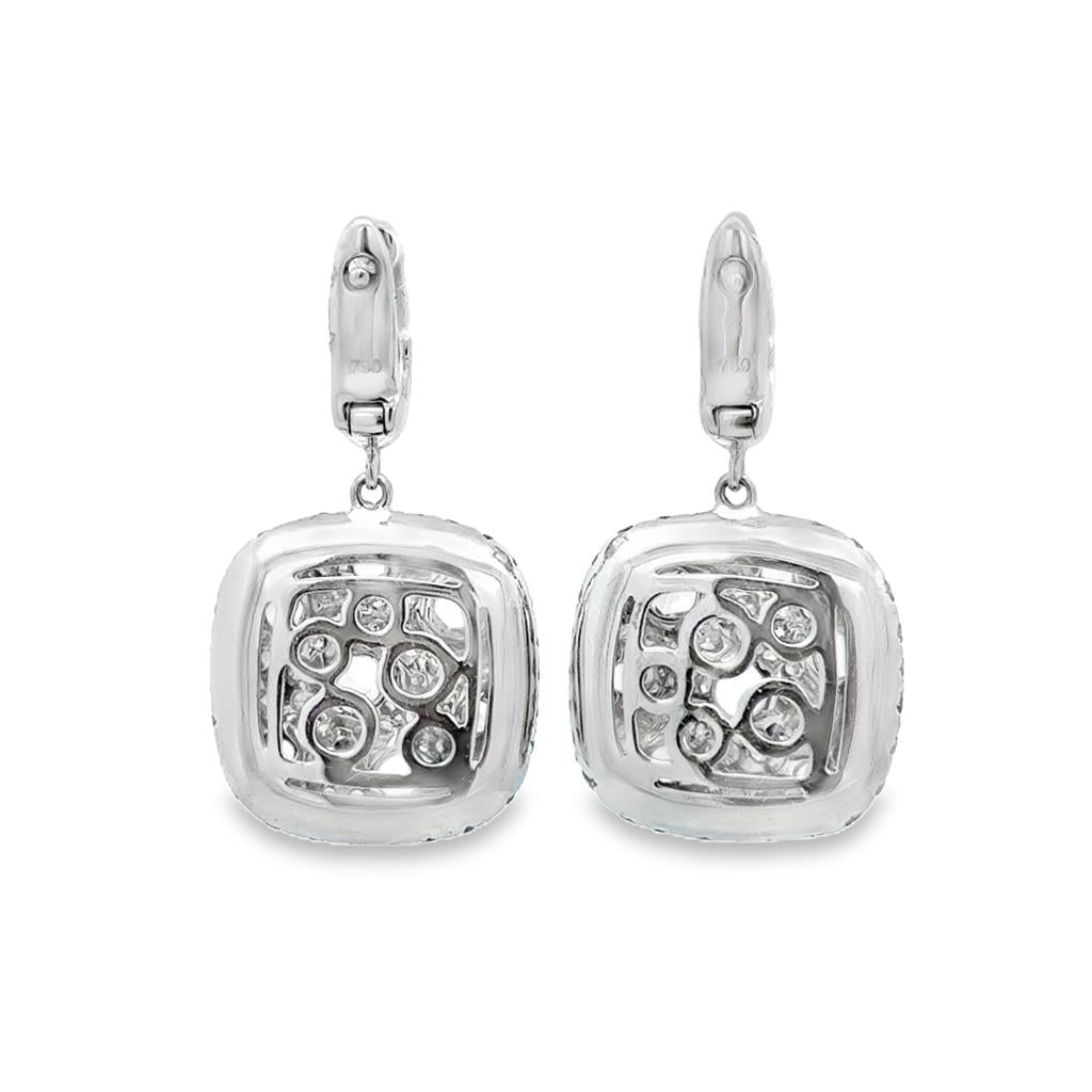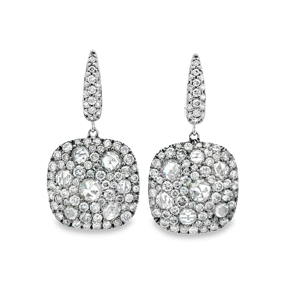 These exquisite new drop earrings showcase 4.28 carats total weight of luminous rose cut diamonds, celebrated for their soft shimmer and vintage-inspired charm. The cushion-shaped drops are adorned with a mix of rose cut center stones surrounded by pavé-set diamonds, creating rich texture and multidimensional brilliance. Crafted in luxurious 18K white gold and weighing 8.3 grams, the elegant design is completed with diamond pavé leverbacks featuring posts for added security and comfort. Measuring approximately 1 1/4 inches in length, these refined earrings offer timeless sophistication with a modern statement presence.