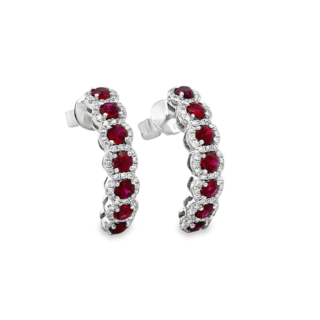 These stunning half-hoop earrings showcase 1.81 carats of vivid round rubies framed by 0.48 carats of sparkling round diamonds, all set in polished 14K white gold. The rich red hue of the rubies contrasts beautifully with the brilliance of the diamonds, creating an elegant and timeless design. Measuring 22mm in length and 5mm in width, these earrings feature secure post backs and offer a refined pop of color perfect for any occasion.
