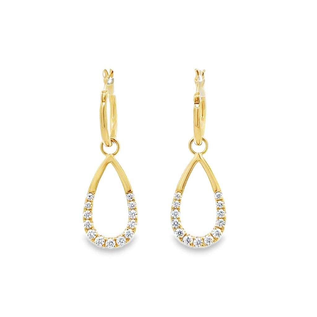 These graceful 14K yellow gold earrings feature detachable diamond teardrop drops totaling 0.47 CTW, creating a versatile two-in-one design that effortlessly transforms from elegant drops to classic gold hoops. The SI/I color diamonds trace the lower arc of each teardrop, adding radiant sparkle and refined movement. When removed, the top hoops—measuring 12.5mm—become timeless everyday earrings with secure post-hinge backs. Measuring approximately 1 1/4 inches long when worn with the drops, this brand-new pair offers both brilliance and adaptability in a beautifully crafted silhouette.