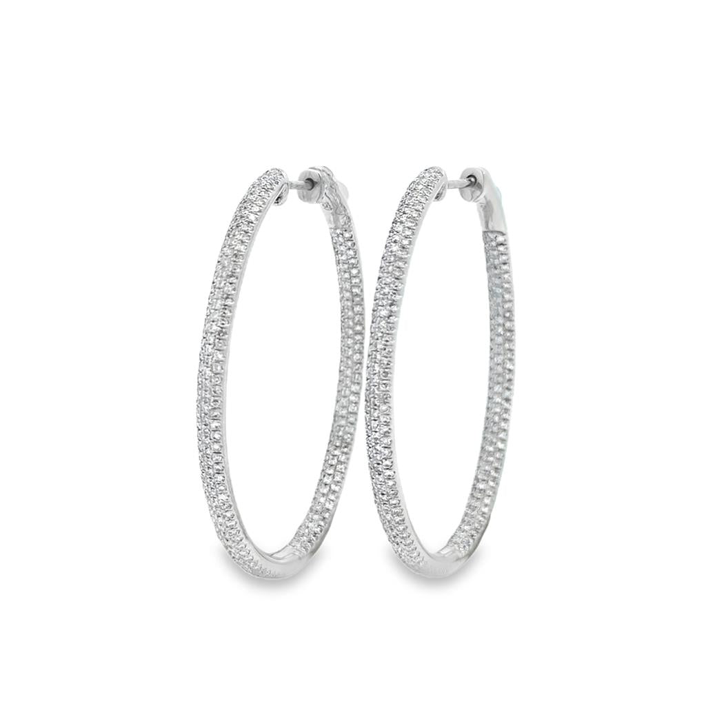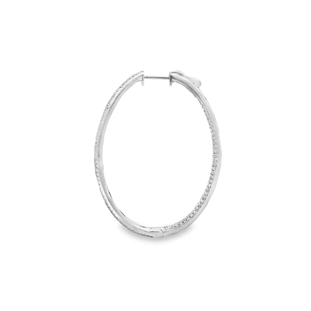 These elegant inside-out oval hoop earrings are crafted in luxurious 18K white gold and showcase a brilliant display of round diamonds totaling approximately 1.43 CTW. Designed with diamonds set both inside and outside the hoops, they deliver continuous sparkle from every angle. Measuring approximately 1.5 inches in length and 2.7mm wide, these hoops feature a sleek profile with a secure hinged opening for comfortable everyday wear. A timeless diamond essential, perfect for dressing up or elevating a classic look.