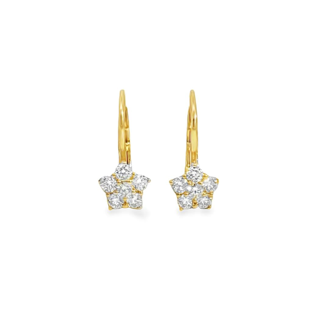 These elegant 14K yellow gold earrings showcase a charming 7.5mm floral motif, each petal formed by sparkling round brilliant diamonds totaling 0.75 CTW. Designed with secure lever-back closures, the earrings measure approximately 16.5mm in total length. Their bright, timeless look makes them a perfect everyday luxury or a thoughtful gift for someone special.