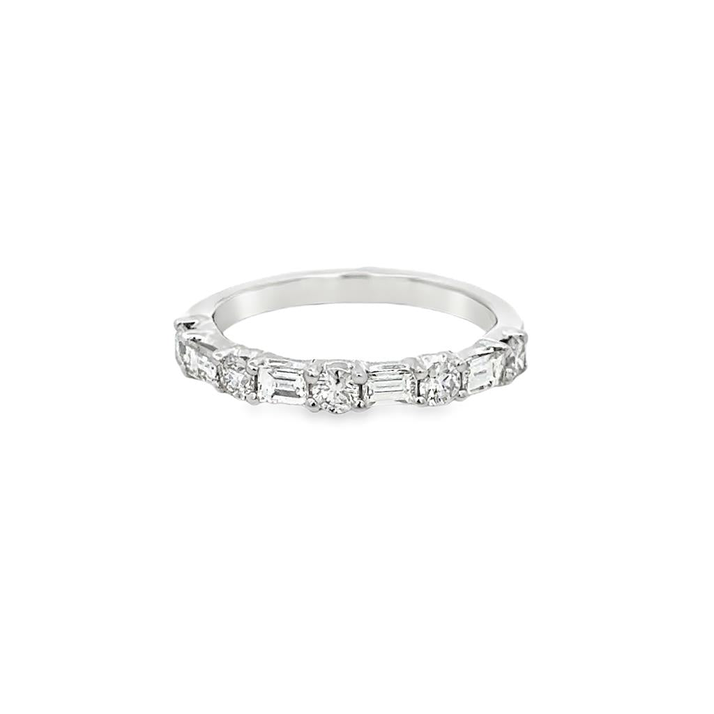 This elegant diamond band combines the clean geometry of baguette diamonds with the brilliance of round diamonds for a refined, timeless look. Crafted in 14K white gold, the band features .38 CTW of baguette diamonds paired with .36 CTW of round diamonds, creating a beautiful alternating pattern of sparkle and structure. Measuring 2.5mm wide, this ring offers a delicate yet impactful presence on the hand. It is currently a size 5 3/4 but can be made in most sizes to ensure a perfect fit. Brand new and beautifully crafted.