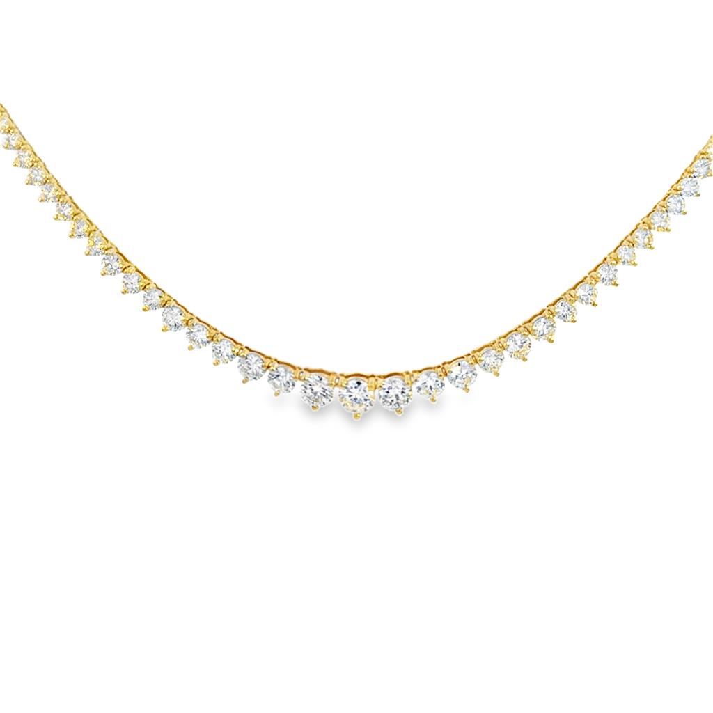 This stunning tennis necklace showcases 10.07 carats total weight of brilliant round diamonds set in an elegant 3-prong design. The diamonds graduate beautifully from 5mm at the center to 2.3mm toward the clasp, creating a smooth and balanced transition of sparkle. Crafted in rich 18K yellow gold, this new necklace features 150 diamonds in total, offering exceptional brilliance and refinement. Measuring 17 inches in length and weighing 17 grams, it is a timeless piece that sits gracefully along the neckline—perfect for both everyday luxury and special occasions.