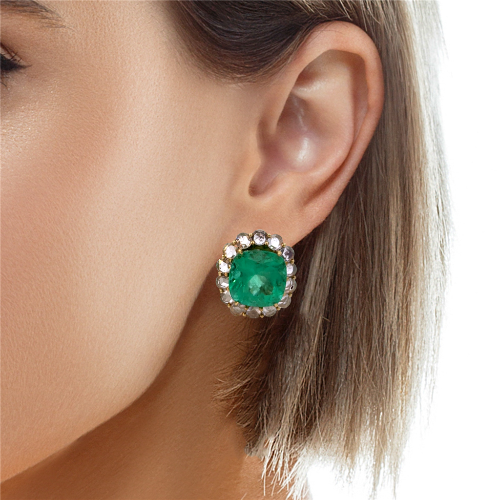 These extraordinary stud earrings feature a vibrant 10.33 carats total weight of richly saturated emeralds in cushion-cut form, each surrounded by a sparkling halo of rose-cut diamonds totaling 3.32 carats. Crafted in luxurious 18K yellow gold, the contrast between the vivid green emeralds and shimmering diamonds creates a timeless and regal look. Designed with stud post backs paired with secure leverbacks, these earrings offer both elegance and stability. Measuring approximately 15.5mm x 17.5mm and weighing 7 grams, this new pair is a bold and exquisite statement in fine gemstone jewelry.