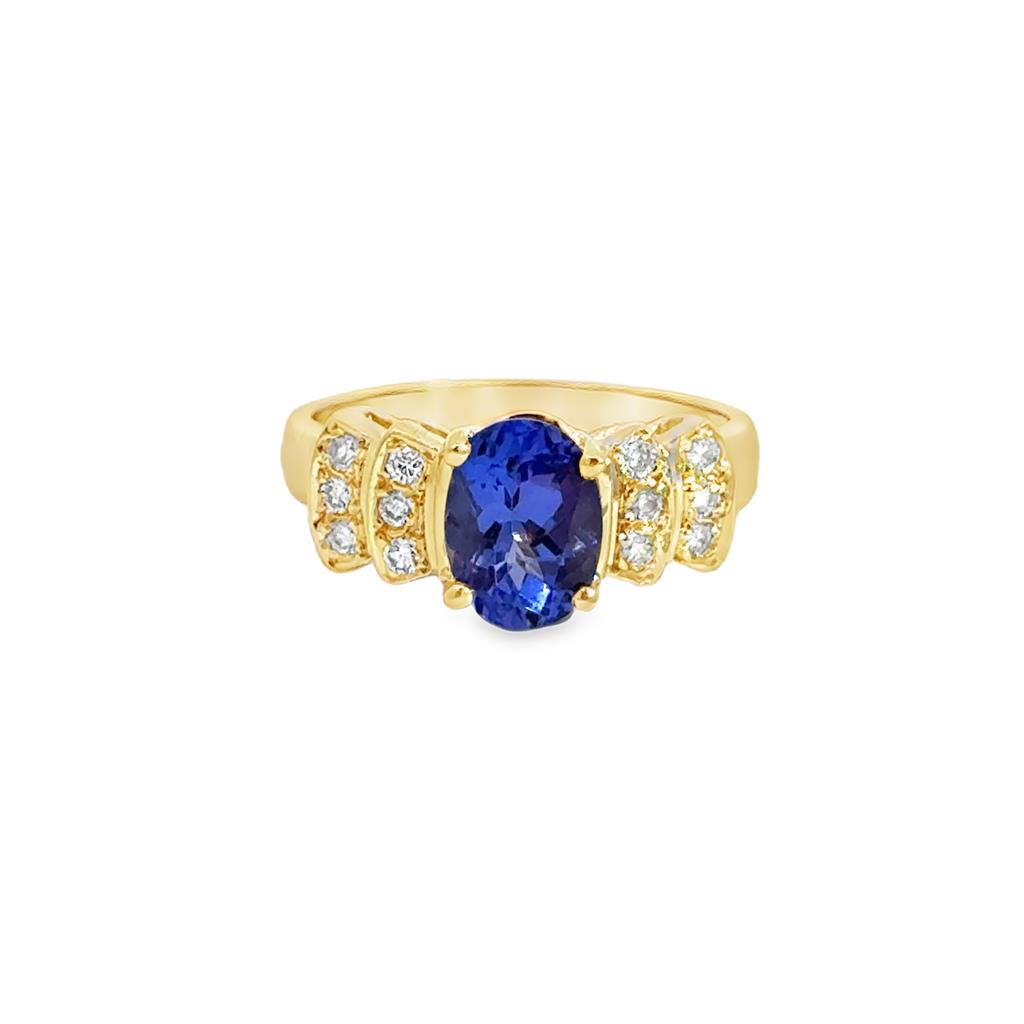 This elegant ring showcases a vibrant oval-cut tanzanite measuring approximately 7.8 x 6.5mm, complemented by .18 carats total weight of sparkling round diamonds. The rich blue-violet hue of the tanzanite beautifully contrasts with the warmth of the 14K yellow gold setting. The diamond-accented shoulders add brilliance and sophistication, creating a refined and timeless design. Ring size is 5 3/4 but can be sized.