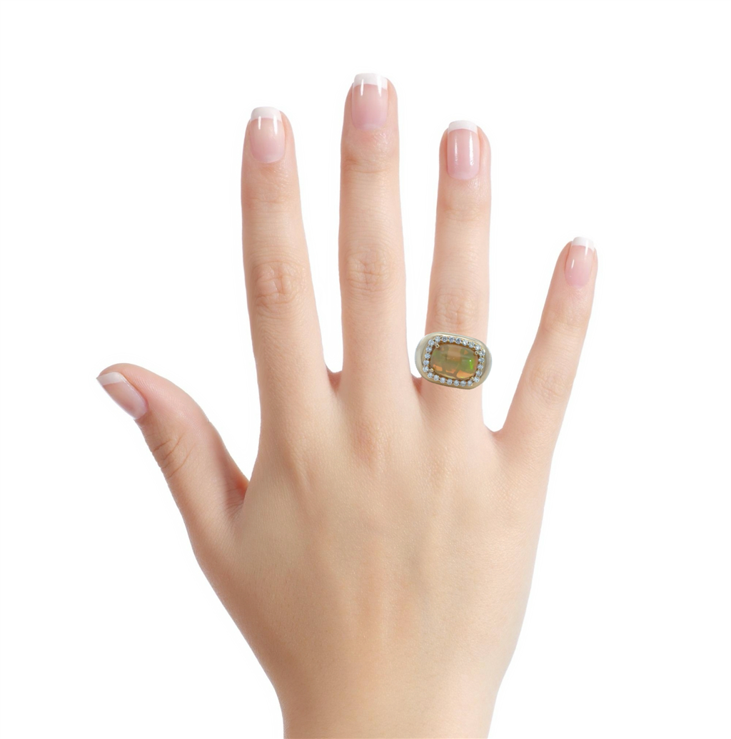 This bold and elegant ring showcases a 3.70 carat opal, glowing with iridescent flashes of color, framed by a halo of brilliant diamonds totaling 0.55 carats. Crafted in 14K yellow gold, the substantial design measures 15mm across the top, giving it striking presence. Currently a size 6.75 but resizable, this opal and diamond ring is a unique statement piece that blends timeless luxury with natural beauty.