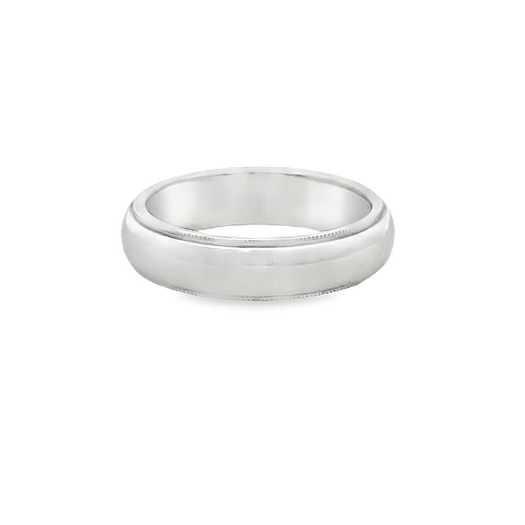 Classic and refined, this men’s wedding band is crafted in solid platinum and features elegant milgrain detailing along the edges. Measuring 5mm wide, the ring offers a timeless look with a comfortable fit, perfect for daily wear. Its understated sophistication makes it an enduring symbol of commitment and style. Ring size 7 1/4 but can be sized.