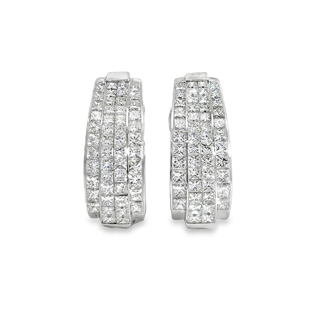 These stunning earrings showcase 5.01 carats total weight of princess-cut diamonds, meticulously set in a luxurious 18K white gold design. Featuring three rows of dazzling diamonds, these earrings radiate brilliance and sophistication. The substantial 19.71-gram gold setting enhances their bold elegance, while the leverback closures with posts ensure both comfort and security. Measuring 1 inch long and 10mm wide, these impressive hoop-like earrings make a refined statement for any occasion.