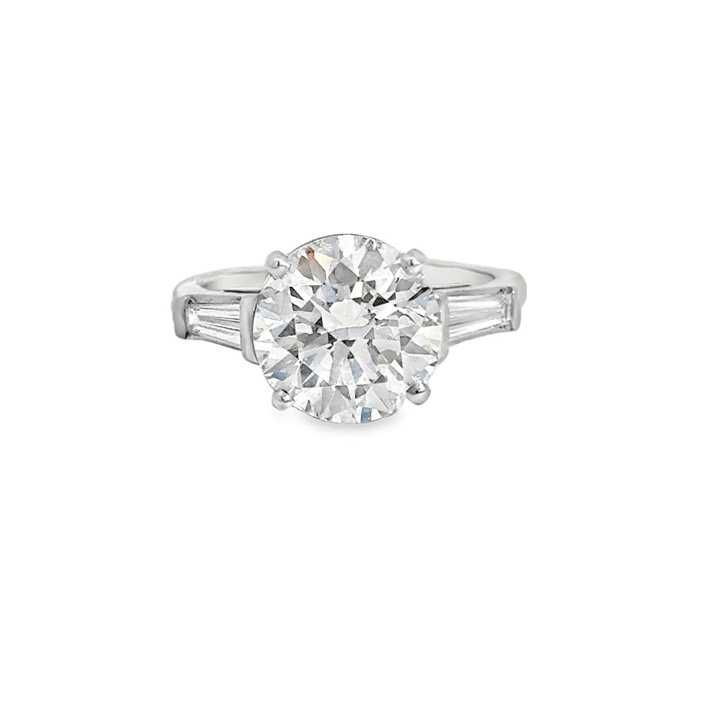 This magnificent engagement ring features a 4.01 carat GIA-certified round brilliant diamond, graded H color and SI2 clarity (Report No. 2185824074). The center stone is elegantly flanked by two tapered baguette diamonds, creating a timeless and sophisticated silhouette. Expertly crafted in platinum, this classic three-stone design showcases exceptional brilliance and enduring beauty. Currently a size 6, this ring can be resized for a perfect fit.