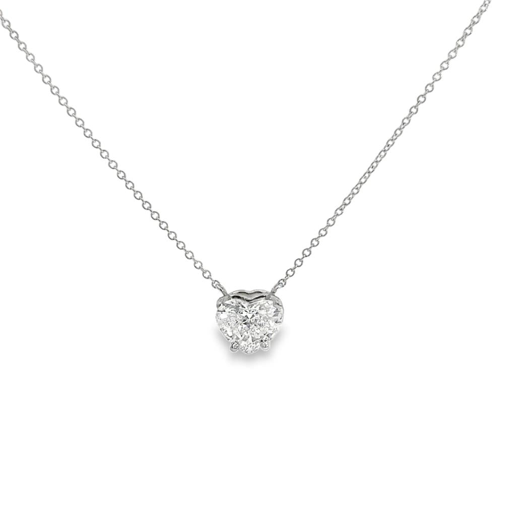 This exquisite pendant showcases a 1.36 carat GIA-certified heart-shaped diamond, graded F for color and VS2 for clarity. Set in lustrous platinum, the diamond is elegantly suspended from an 18-inch chain with a secure spring ring clasp. This romantic design highlights timeless elegance and heartfelt sophistication, making it a perfect gift or personal treasure.