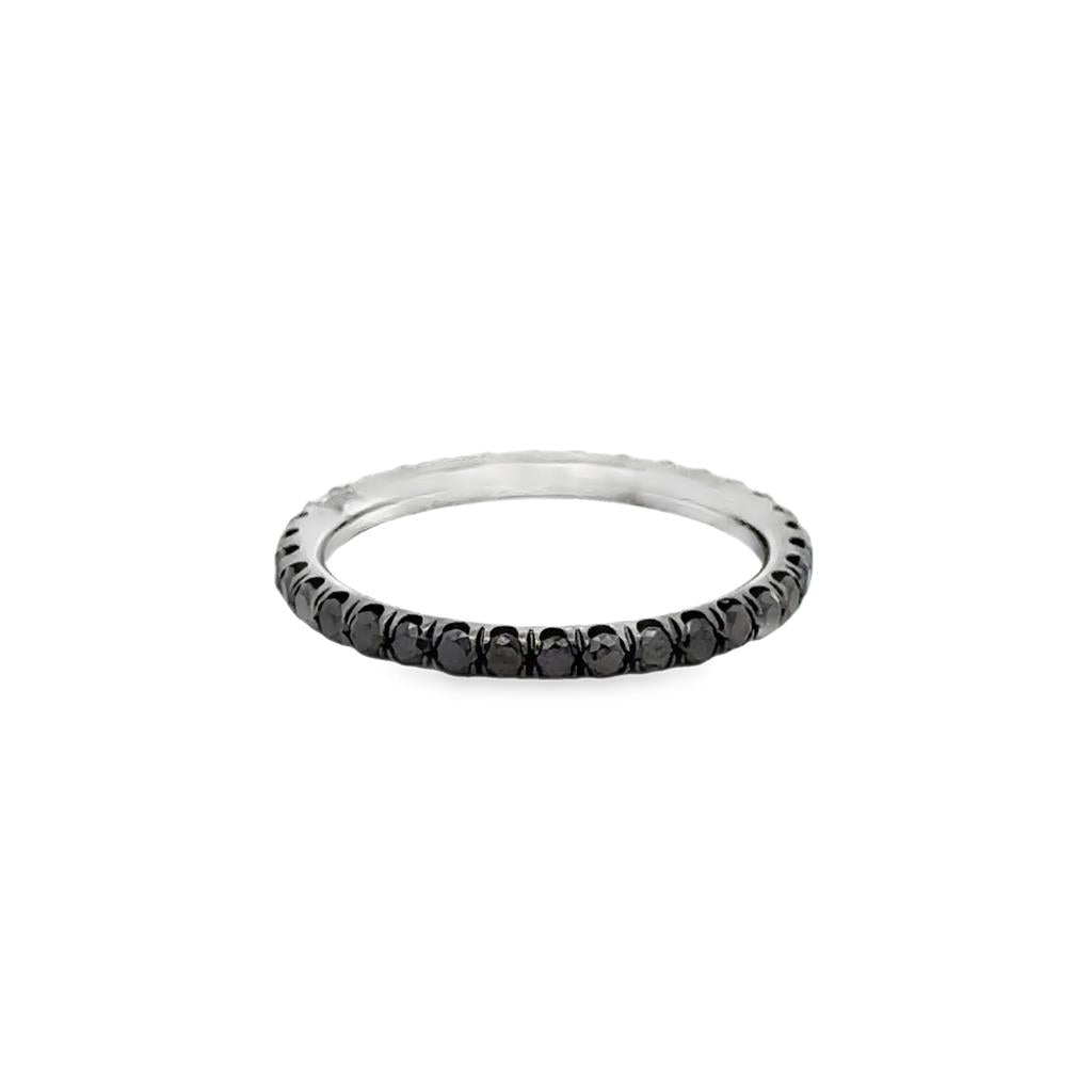 This striking pre-owned band ring features 0.50 carat total weight of round black diamonds set in 18K white gold and finished with rich black rhodium for a bold, modern look. Measuring 2mm wide, this sleek design offers a refined silhouette with dramatic contrast, perfect for stacking or wearing as a standalone statement. Sized at 5¼, it delivers a chic, contemporary elegance that complements any jewelry collection.