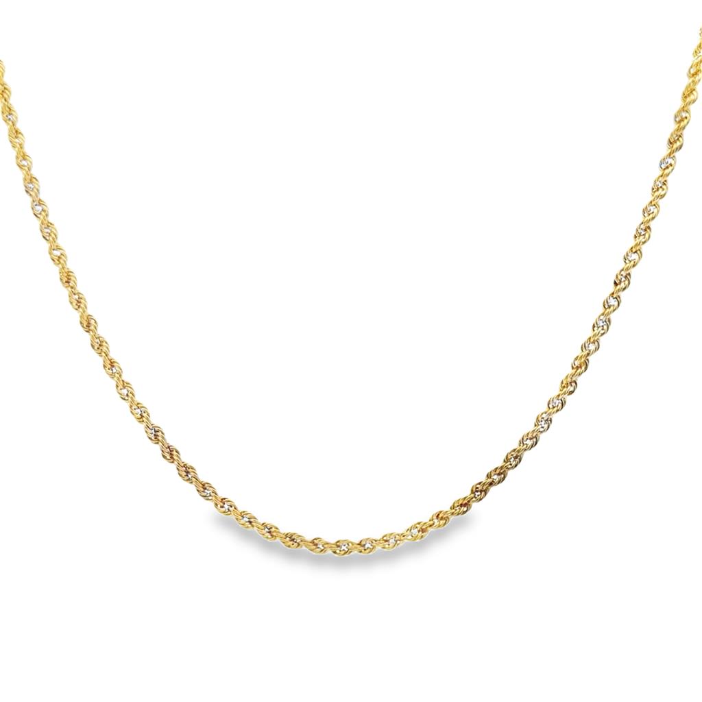 This pre-owned 14K yellow gold rope chain necklace showcases a timeless, classic design with beautifully twisted links that create a rich texture and radiant shine. Measuring 3mm in width and 19 inches in length, this chain offers just the right balance of presence and versatility — perfect for layering or wearing on its own. The piece is finished with a secure spring ring clasp for everyday comfort and durability. A staple in any fine jewelry collection, this rope chain embodies sophistication and enduring style.