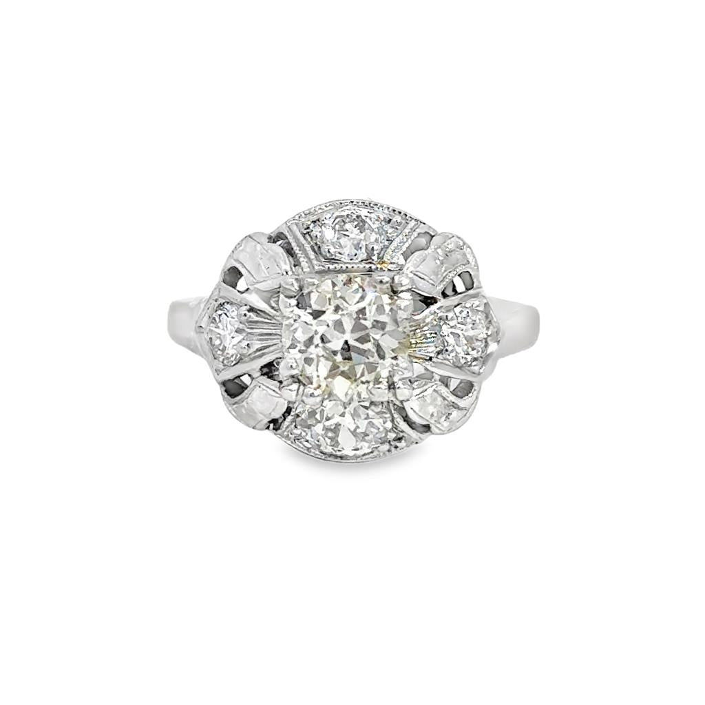 This exquisite antique ring is crafted in 14K white gold and features a stunning total diamond weight of 1.50 carats. At its center sits a brilliant 1.00 carat round diamond, surrounded by additional accent diamonds that enhance its sparkle and presence. The beautifully detailed top measures approximately 13.5MM across, showcasing elegant vintage styling and dimensional design. A timeless estate piece perfect as an engagement ring or statement ring, this ring is size 6 1/4 and can be sized for the perfect fit.