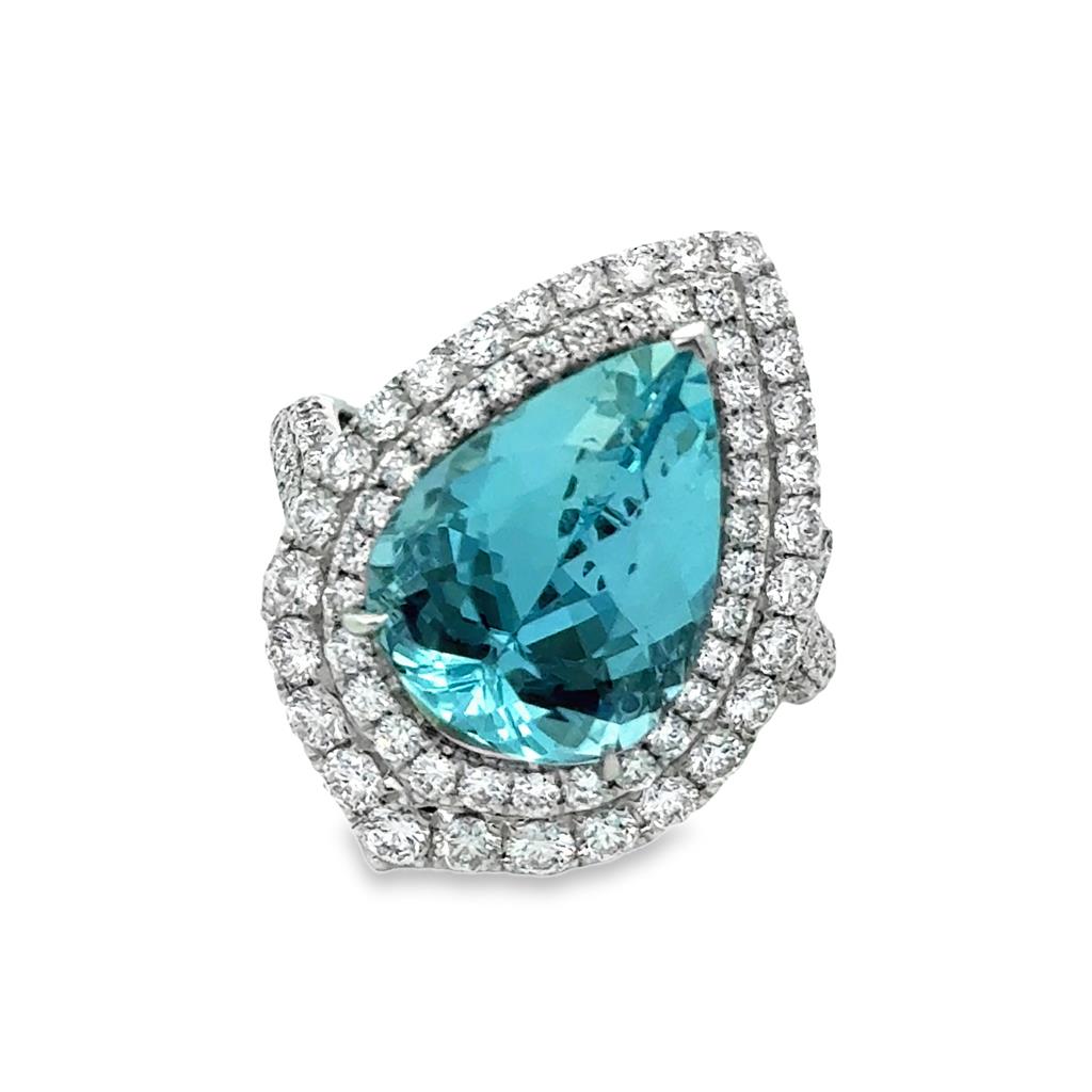 5.30 CT Pear Shape Aquamarine & 1.41 CTW Diamond Double Halo Ring 18K White Gold