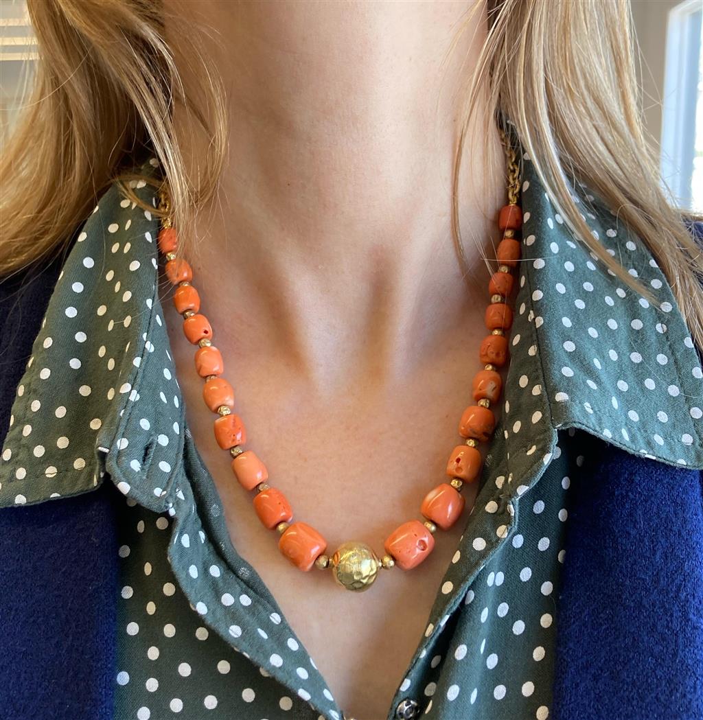 Invigorate your jewelry collection with the vibrant 18K Yellow Gold Coral Beaded Necklace by Sal Praschnik. This necklace features richly hued coral beads, each one uniquely shaped and strung to create a lively cascade of color. The warm, polished 18K yellow gold beads interspersed throughout add a luxurious contrast and enhance the natural beauty of the coral. This Sal Praschnik creation is a celebration of organic textures and sumptuous tones, designed to make a bold statement.