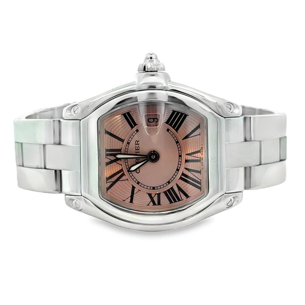This pre-owned Ladies Cartier Roadster watch features a refined 31mm stainless steel case paired with a polished stainless steel bracelet. Showcasing a distinctive pink dial with bold Roman numerals and luminous hands, this iconic Roadster design reflects Cartier’s signature blend of elegance and sporty sophistication. The watch is in great condition and is completed with a date display and smooth bezel, making it a timeless luxury accessory suitable for everyday wear or special occasions. This piece comes complete with original Cartier booklets, adding to its collectability and value.
