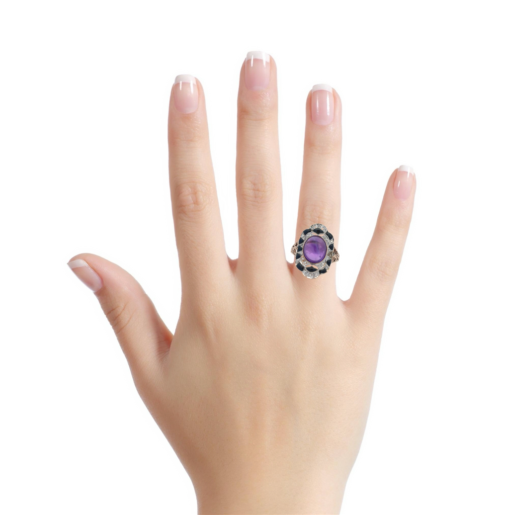 This striking pre-owned statement ring is crafted in 14K two-tone gold and showcases a rich cabochon amethyst at its center. The oval amethyst is framed by alternating black onyx and sparkling diamond accents, totaling approximately 0.22 carats. The bold top measures 24.5mm, giving the ring a commanding presence. Currently a size 9, this piece can be resized for a custom fit. With its mix of gemstones and vintage-inspired styling, this ring embodies both artistry and elegance.