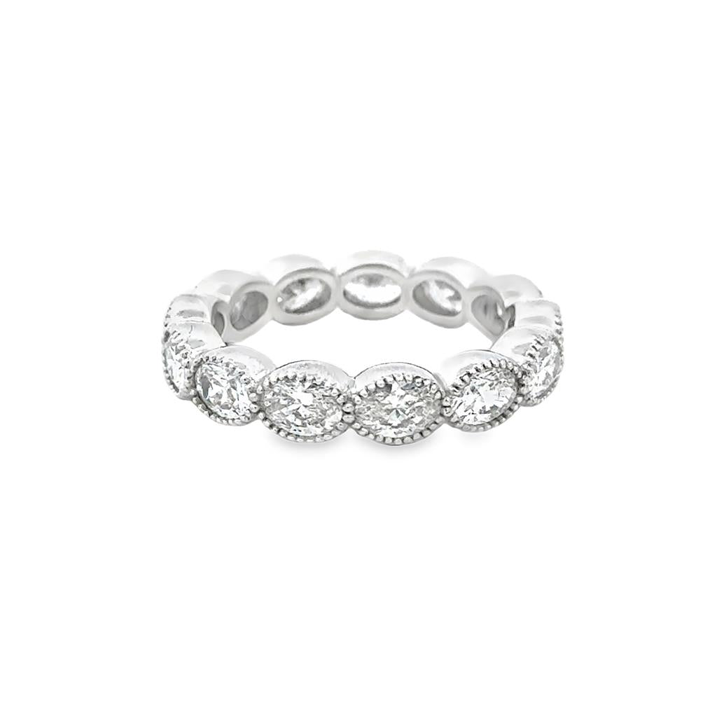 2.46 CTW Oval Diamond Eternity Band Ring in 18K White Gold with Milgrain Detail