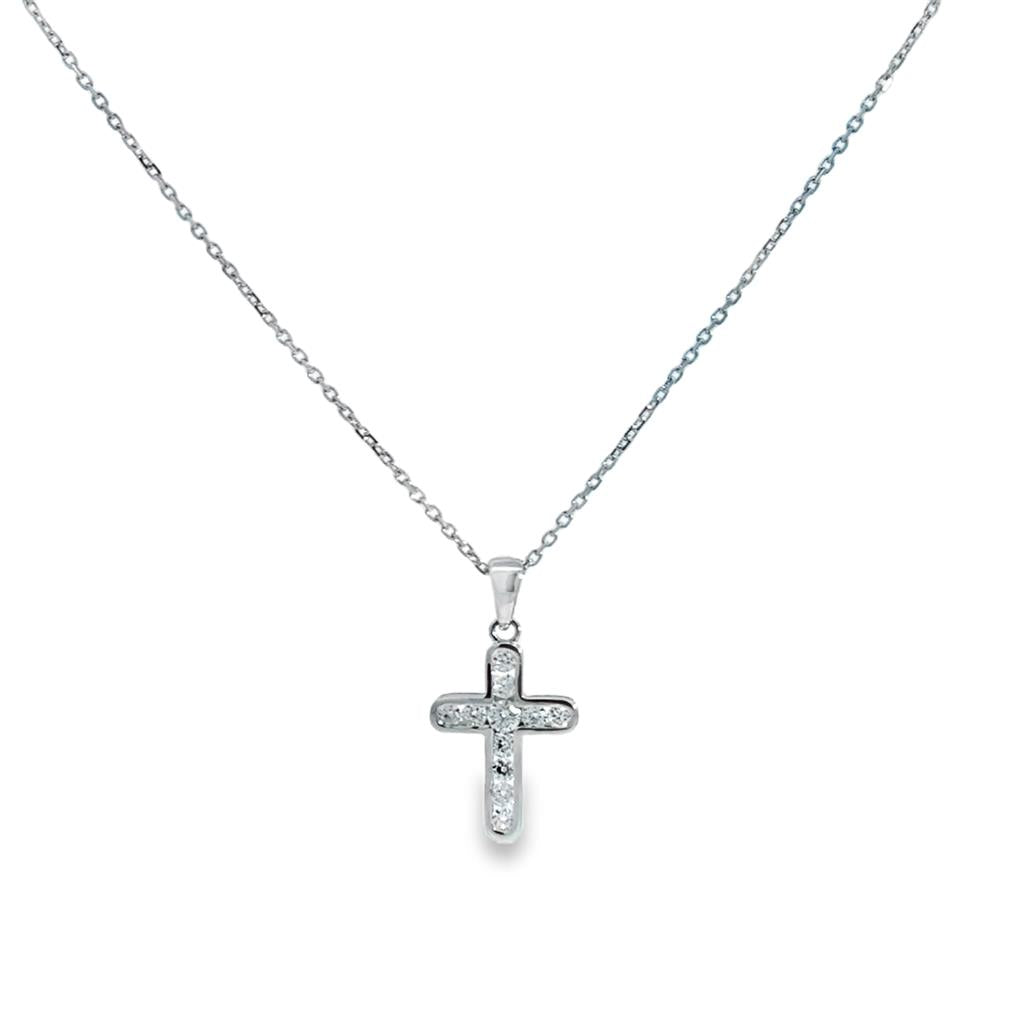 This elegant cross necklace is crafted in 14K white gold and set with 0.48 carats total weight of round brilliant diamonds in a channel setting. The cross pendant measures 18mm in height, suspended from an 18-inch chain for a refined and classic look. Perfect for everyday wear or as a meaningful gift, this necklace combines timeless faith with radiant sparkle.