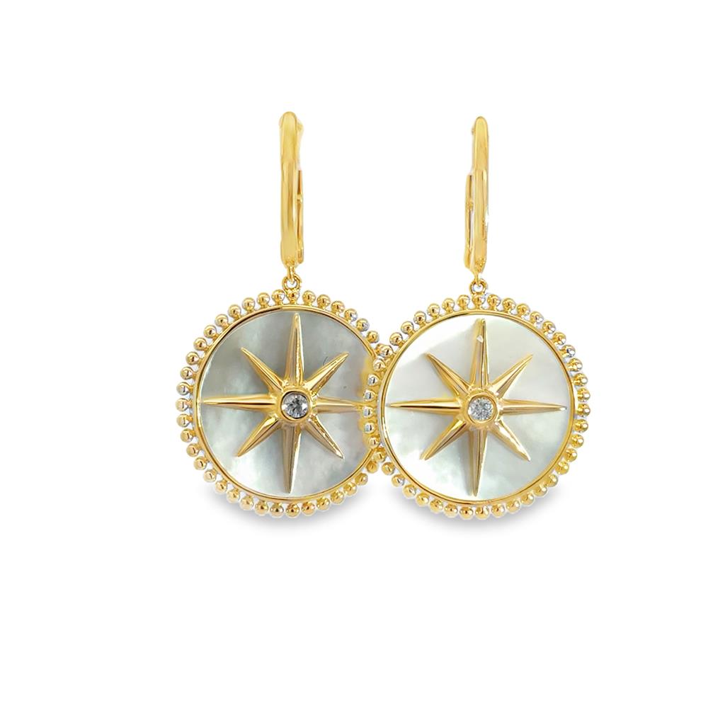 These celestial-inspired Doves drop earrings exude elegance and sophistication. Crafted in 18K yellow gold, each earring features a luminous 8.21-carat total weight mother of pearl inlay, enhanced by a radiant starburst design. A delicate 0.07-carat total weight of diamonds sits at the center of each star, adding a subtle touch of brilliance. Encased in a beaded gold frame and secured with lever-back closures, these 1.4-inch-long earrings bring a timeless yet modern touch to any jewelry collection.